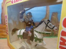 Cheval en plastique peint. De la marque starlux. Un fabricant -> starlux. Une epoque moyen age. Une echelle de type 1:32 60mm. Par exemple: ancienne, chapeau. Occasion ici en France ¬