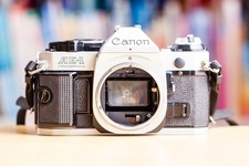 35 mm canon. D'une couleur argenté et modèle canon ae1 en outre le format est 50 mm , un type de focale -> manuelle ¦ Par exemple: objectif, canon ¬